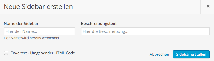 Achten Sie darauf, dass Sie einen eindeutigen Namen für die neue Sidebar vergeben, so dass Sie auch in einigen Wochen oder Monaten noch wissen, wofür Sie diese angelegt haben. Hilfreich ist es auch, eine kurze Beschreibung anzugeben. Das hilft insbesondere bei sehr vielen individuellen Widgetbereichen die Übersicht zu bewahren.
