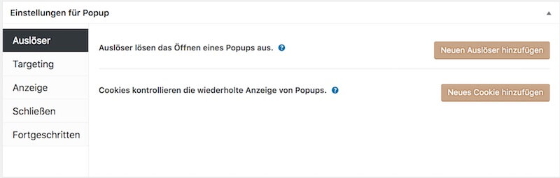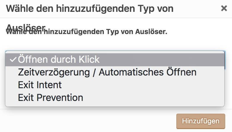 Der Auslöser legt fest, unter welchen Bedingungen sich das Popup öffnet. Durch Klick auf „Neuen Auslöser festlegen“ kommst Du in die Einstellungen für diese Option.