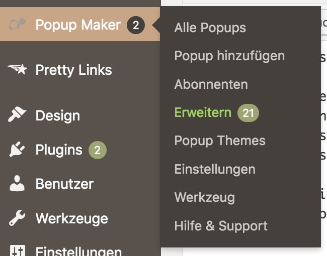 Nach der Installation des Plugins findest Du in der Seitenleiste Deines Dashboards einen neuen Menüpunkt „Popup Maker“.